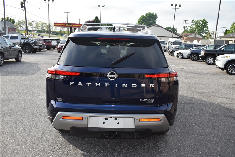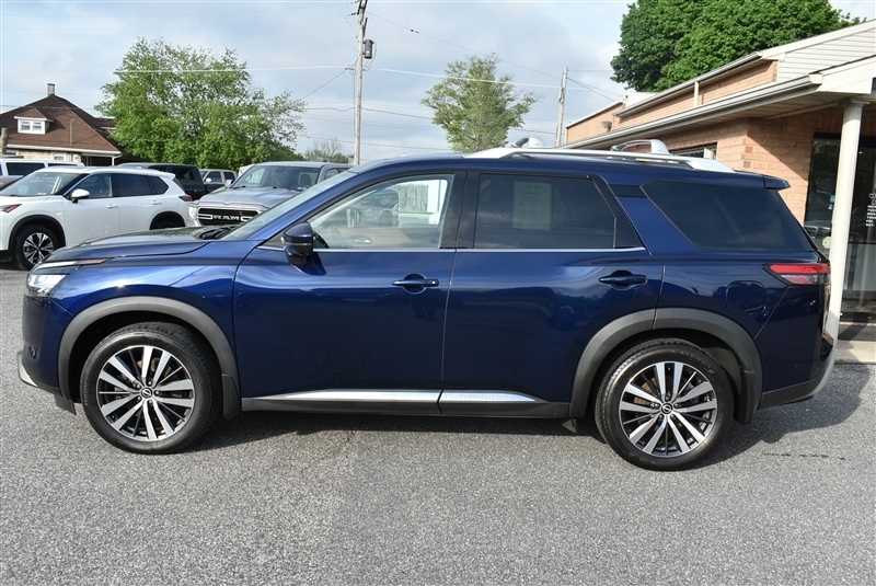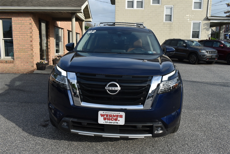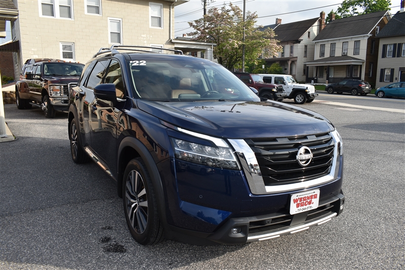 Introducing the magnificent 2022 Nissan Pathfinder Platinum, now available at Werner Bros Auto Sales. This sophisticated blue Pathfinder is powered by a robust 3.5L 6-cylinder engine paired with a smooth CVT transmission, ensuring a ride that's both powerful and graceful. Experience the pinnacle of luxury with the Platinum trim's leather upholstery, dual power seats, and premium sound system. This Pathfinder is loaded with state-of-the-art options to elevate your driving experience. Navigate with confidence using the 360-degree camera and adaptive cruise control. Enjoy seamless connectivity with Android Auto and Apple CarPlay, and let the heads-up display keep you informed without taking your eyes off the road. Safety features like automatic emergency braking, blind-spot warning, and lane-keeping assistance provide peace of mind for every journey. Luxury meets practicality with dual-zone air conditioning, a panoramic sunroof, and a hands-free remote trunk. This Pathfinder also sports a towing package and roof rack for all your adventure needs. To see this exceptional vehicle for yourself, contact Werner Bros Auto Sales at 717-244-2770 and discover the perfect blend of comfort, technology, and performance.