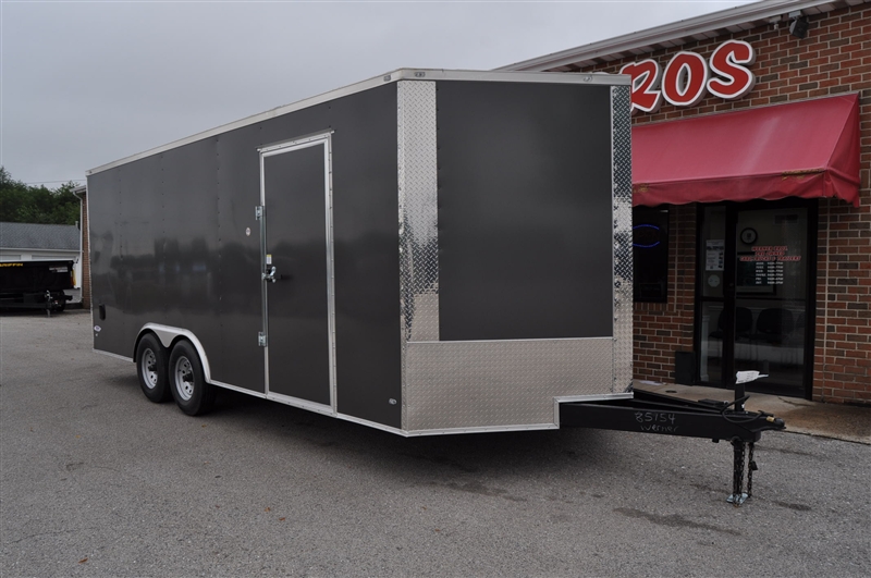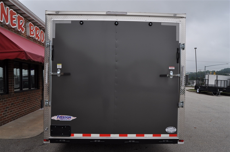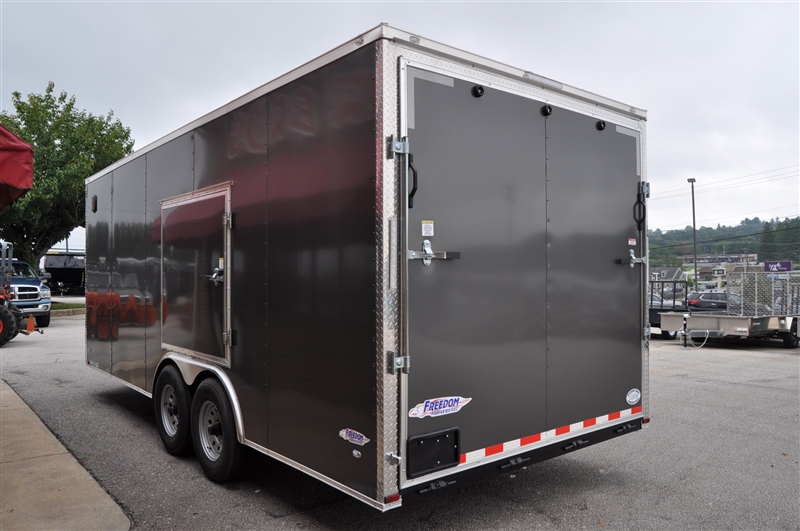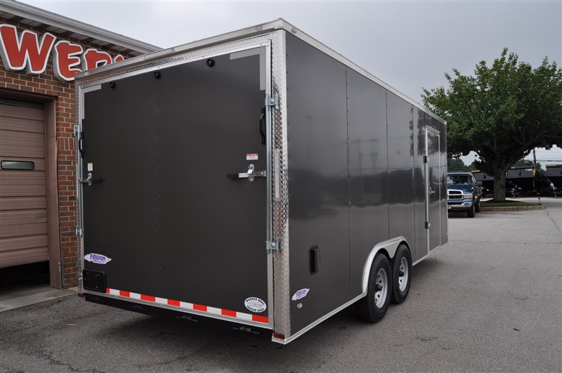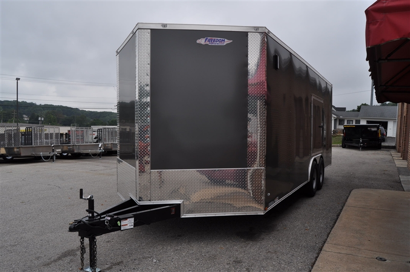 FREEDOM 8.5 X 20 ENCLOSED V NOSE CAR HAULER, 9990 LB GVWR, 7' INTERIOR HEIGHT, 2 - 5200 LB TORSION AXLES, 6 D RINGS IN FLOOR, .080 POLYCOR SEMI SCREWLESS EXTERIOR, CHARCOAL GRAY, ATP ON ALL CORNERS, ATP STONE GUARD, 12'' OC FLOOR SUPPORTS, 54'' ESCAPE DOOR, ELIXIR SIDE DOOR WITH BAR LOCK AND PADDLE LATCH, REAR RAMP DOOR, RADIAL TIRES, PLYWOOD WALLS AND FLOOR. EXCELLENT FINANCING AVAILABLE. PLEASE CALL OUR LEADER HEIGHTS LOCATION AT 717-741-1567.