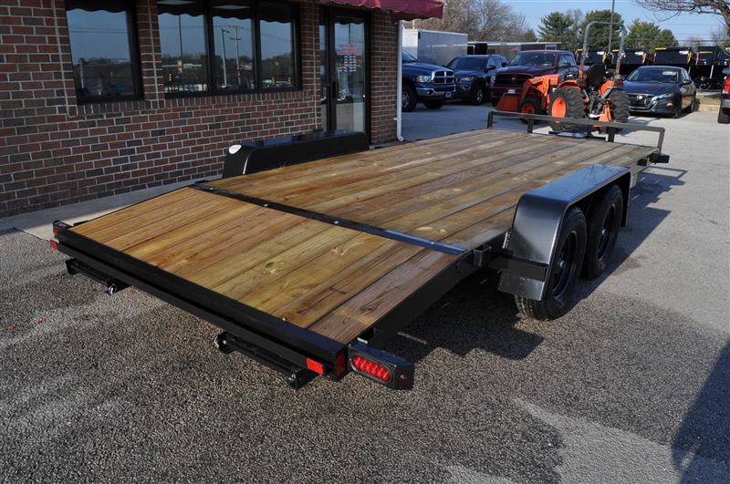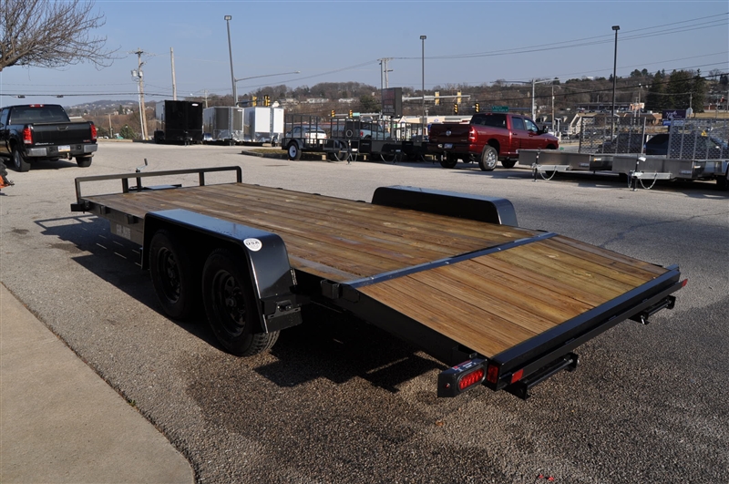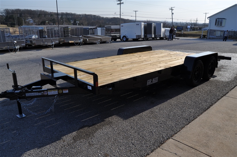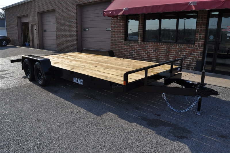 CAR MATE 8 X 18 OPEN CAR HAULER, 7000 LB GVWR, TANDEM AXLE, 15'' RADIAL TIRES AND STEEL WHEELS, ELECTRIC BRAKES, BREAKAWAY SWITCH WITH KIT AND BATTERY, 2-5/16'' COUPLER, SAFETY CHAINS, FRONT JACK, HD STAKE POCKETS, FULL TREATED PINE DECK, 82'' BETWEEN THE FENDERS, BEAVERTAIL, 60'' RAMPS, REAR RAMP STORAGE. EXCELLENT FINANCING AVAILABLE. PLEASE CALL OUR LEADER HEIGHTS LOCATION AT 717-741-1567.