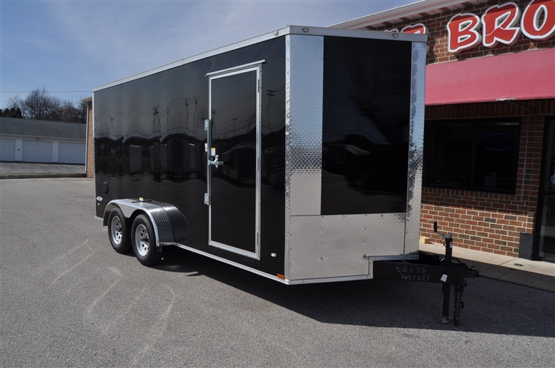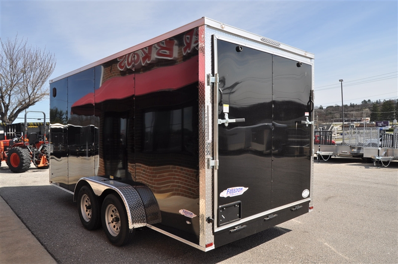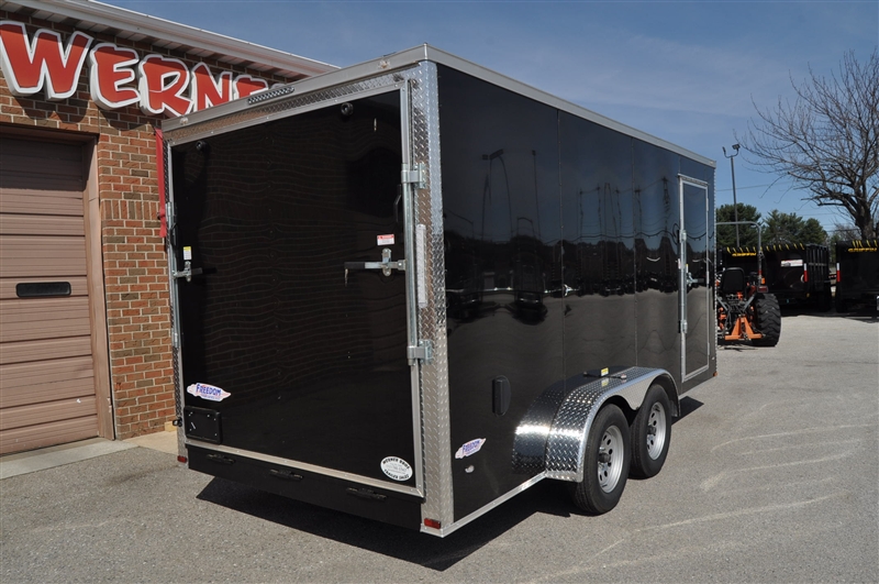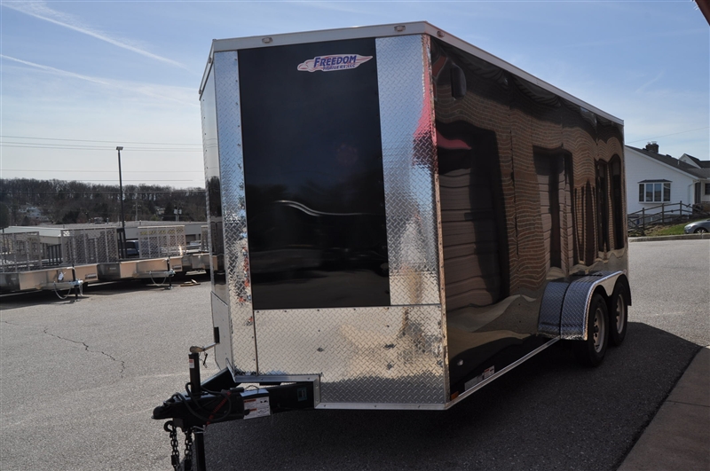 FREEDOM 7 X 16 ENCLOSED V NOSE TRAILER, 6'9'' INTERIOR HEIGHT, 12'' OC FLOOR SUPPORTS, .080 POLYCORE, SEMI SCREWLESS, PLYWOOD WALLS AND FLOOR, REAR RAMP DOOR, RADIAL TIRES AND LED LIGHTS, DOME LIGHT WITH WALL SWITCH, ATP ON ALL CORNERS, EXTERIOR COLOR = BLACK. EXCELLENT FINANCING AVAILABLE. PLEASE CALL OUR LEADER HEIGHTS LOCATION AT 717-741-1567.