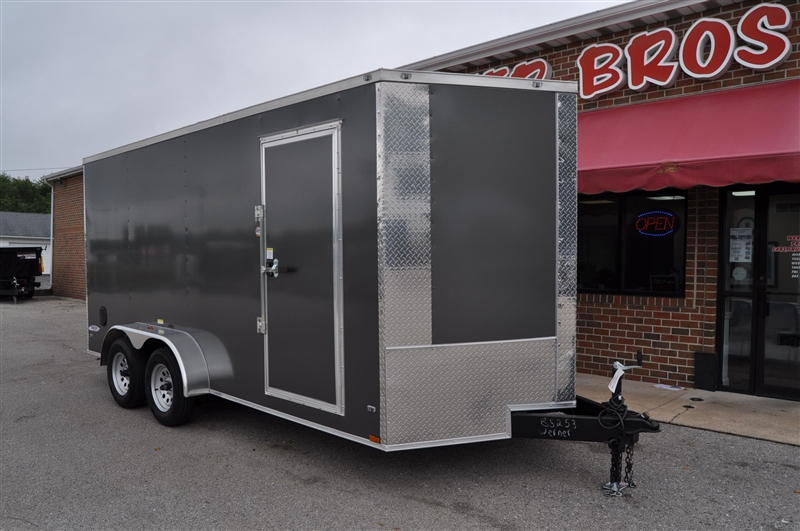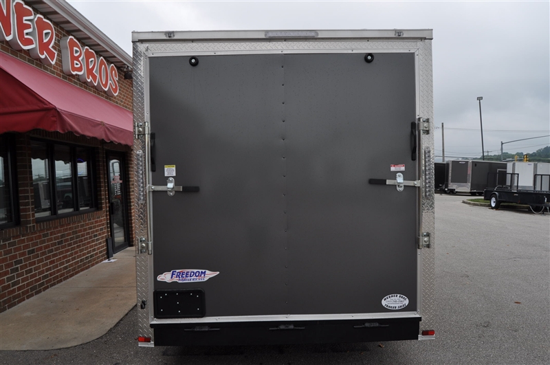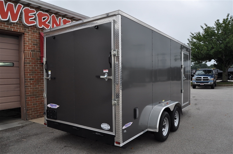 FREEDOM 7 X 16 ENCLOSED V NOSE TRAILER, 7000 LB GVWR, 6' 9'' INTERIOR HEIGHT, PLYWOOD WALLS AND FLOOR, 12'' OC FLOOR SUPPORTS, .080 POLYCORE EXTERIOR, SEMI SCREWLESS EXTERIOR, RADIAL TIRES AND STEEL WHEELS, ELIXIR SIDE DOOR WITH BAR LOCK AND PADDLE LATCH, REAR RAMP DOOR, LED LIGHTS. EXCELLENT FINANCING AVAILABLE. PLEASE CALL OUR LEADER HEIGHTS LOCATION AT 717-741-1567.