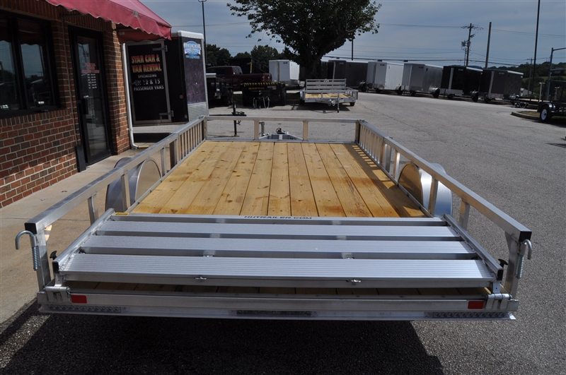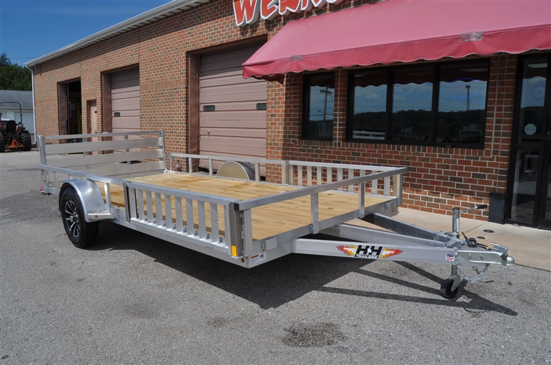H & H ALUMINUM SINGLE AXLE ATV TRAILER, 3 X 2 ALUM ANGLE FRAME, 3 X 2 ALUM ANGLE CROSSMEMBERS, 4 X 2 ALUM TRIPLE TONGUE, 2'' COUPLER, SWIVEL JACK WITH CASTER WHEEL, 2 X 2 ALUM TOP RAIL, 54'' BIFOLD GATE, ALUM FENDERS, 3500 LB AXLE, EZ LUBE HUBS, 15'' RADIAL TIRES AND ALLOY WHEELS, 2'' PT DECKING, ALUMINUM STAKE POCKET TIE DOWNS, SEALED WIRE HARNESS, LED LIGHTS, LIMITED 3 YEAR WARRANTY. EXCELLENT FINANCING AVAILABLE. PLEASE CALL OUR LEADER HEIGHTS LOCATION AT 717-741-1567.