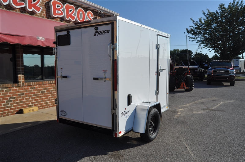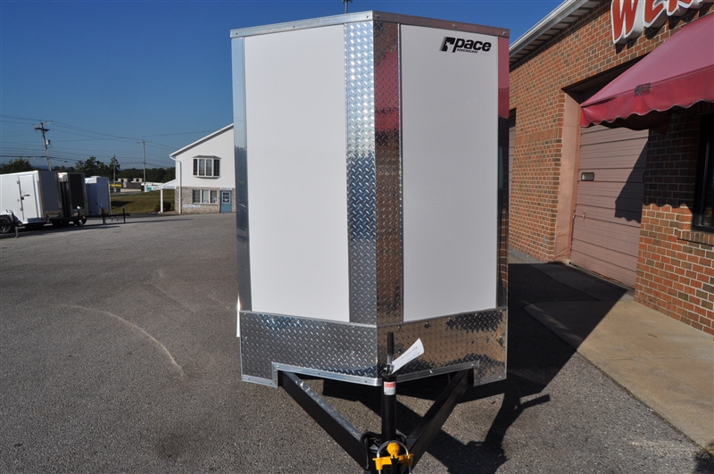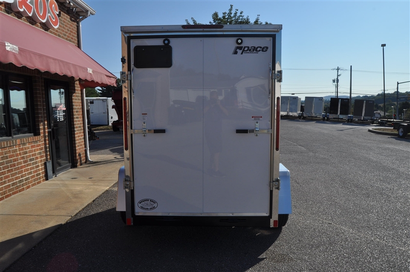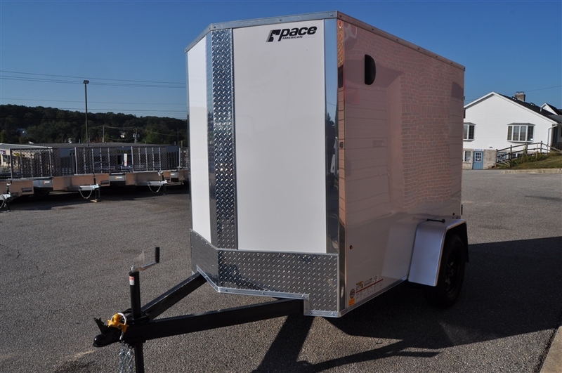 PACE 5 X 8 ENCLOSED V NOSE TRAILER, 2990 LB GVWR, SINGLE AXLE, ATP STONE GUARD AND NOSE PIECE, ALUMINUM TRIM ALL CORNERS, BLACK STEEL WHEELS, 15'' RADIAL TIRES, PLASTIC SIDE VENTS, DOME LIGHT, 24'' SIDE DOOR WITH BAR LOCK AND PADDLE LATCH, RAMP DOOR, LED LIGHTS, 6' INTERIOR HEIGHT, COMPOSIT EXTERIOR. EXCELLENT FINANCING AVAILABLE. PLEASE CALL OUR LEADER HEIGHTS LOCATION AT 717-741-1567.